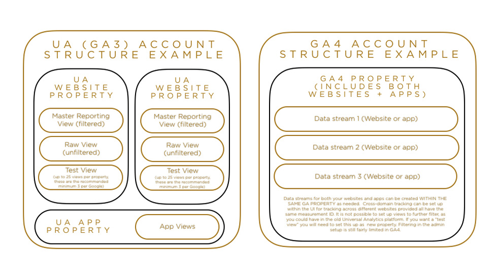 Ma quali sono le differenze più evidenti tra GA3 e GA4? Pur apparendo simili a livello di interfaccia grafica le due piattaforme sono completamente differenti a livello di architettura. Google Analytics 4 è stato progettato in uno scenario in cui app, siti web e social network convivono nell’ecosistema dei canali di comunicazione dei brand. Google Analytics 3 è invece l’evoluzione di un prodotto nato, per intendersi, quando non esistevano nemmeno le schede dei browser ed era possibile aprire una sola finestra per volta.